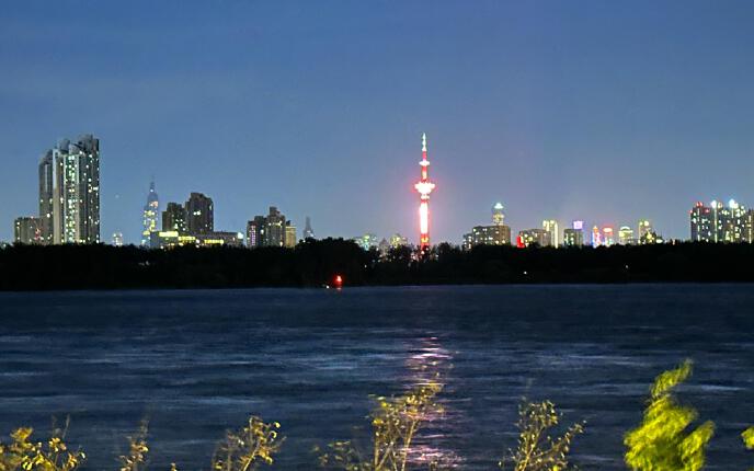 南京‘九大城市客厅"之一的江北新区长江岸线,2021年五一建成开放。夜幕降临,皓月当空,长江两岸,华灯璀璨,相映争辉。从定山大街至朱家山河,全长约5.6公里的健康步道,成为市民休闲徒步的好去处。