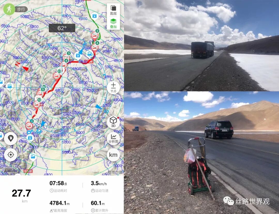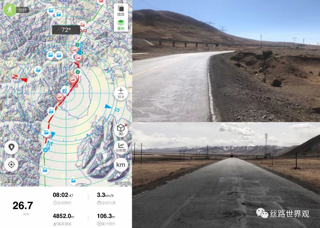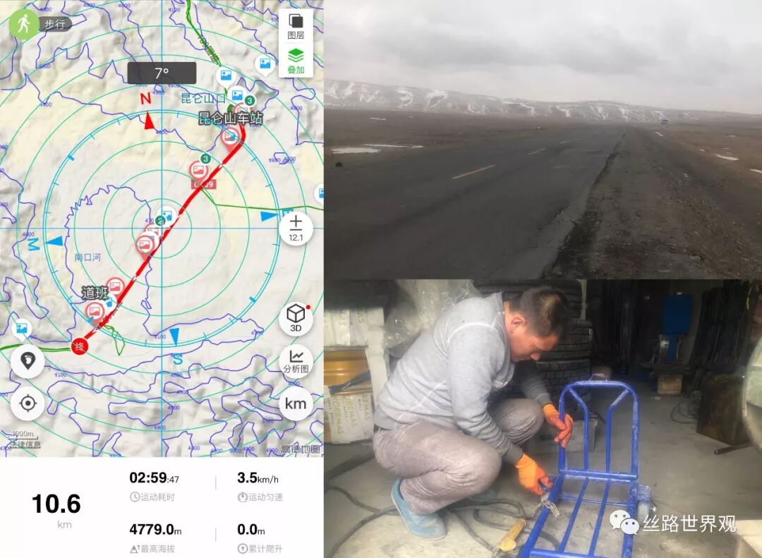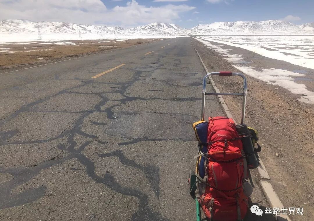 昆仑山口-不冻泉: 徒步十公里,风超大,推车终于奔溃散架了,万念俱灰意志动摇,不想走了,想放弃了,这是我第一次想放弃,就在这时好心皮卡司机向我招手,我非常感谢他,他搭上了我,前往不冻泉镇,在那里我修好了推车并舒缓了身心。