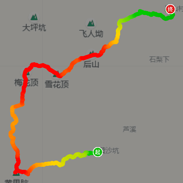 此次登山,整个行程具有丛林、竹林、草坡,峡谷、悬崖、溯溪、陡石壁、石阶、碎石、青苔路、机耕路、急升急降坡等多种地形地貌。经历了一次眼睛在天堂,身体在地狱的历炼!