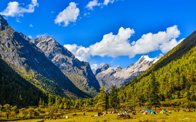 今天早晨从镇上出发,乘坐观光车进入长坪沟,到达喇嘛寺,从喇嘛寺开始徒步穿越长坪沟,途经枯树滩,到达四姑娘山幺妹峰山脚下的木骡子营地露营。