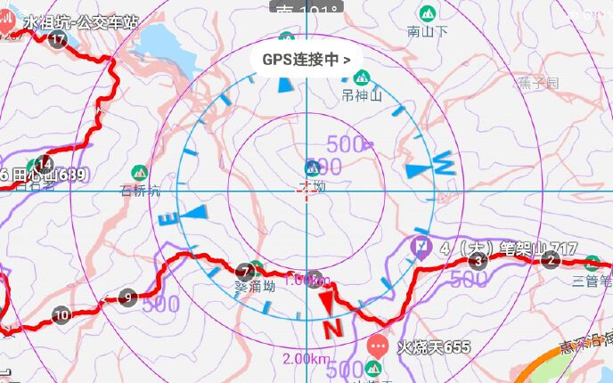 (惠州市惠阳区)小桂村公交站~三管笔(1.4公里)(大)笔架山(3.8公里)~火烧天(5.1公里)~葵涌坳(6.9公里)~石牙头(11.1公里)~田心山(13.1公里)~白石老(13.9公里)~水祖坑公交站(17.5公里)