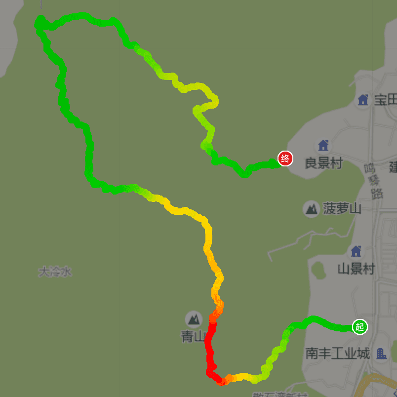 徒步路线:青山村(轻轨)—青山寺径—散石湾横山径—青蝶石河—青山—狮子头—分水岭—五渡水—青大石涧—菠萝山大峡谷—良田坳—良景站(轻轨)