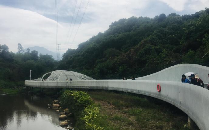 整条栈道建于山谷里的一条小溪上,栈道蜿蜒曲折,联通龙岗六约与罗湖大望之间。