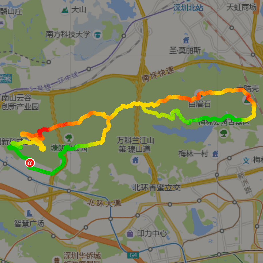 全程徒径:(起点)龙珠门——塘朗山——涂鸦墙——大脑壳——涂鸦墙——龙珠门(终点)