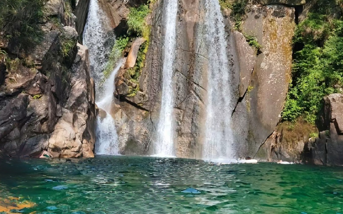 三友瀑布景区位于元宝山密林深处,因其有3束落差约20米的水帘飞流直下,仿佛3个亲密朋友聚在一起而得名。(门票20一位)