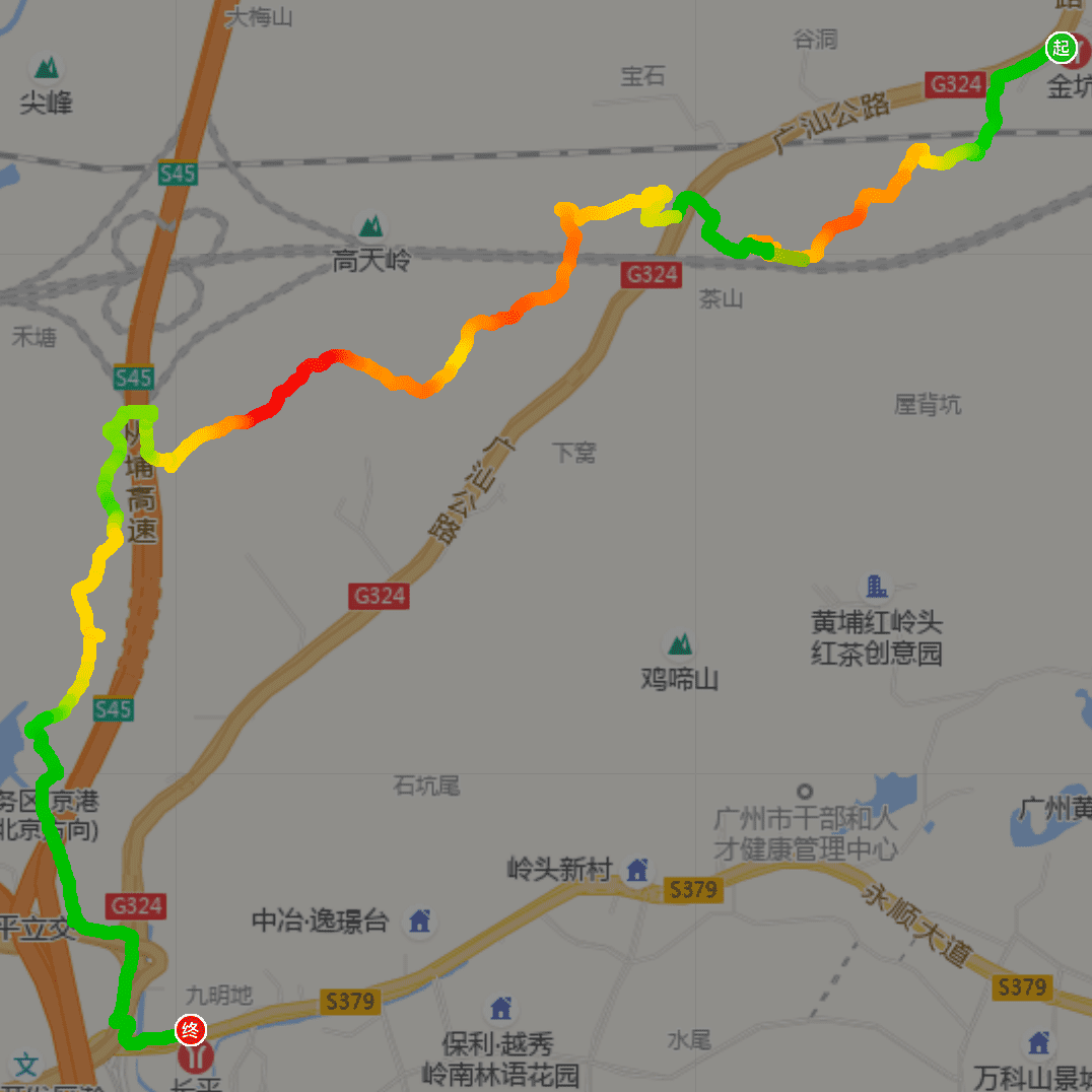金坑地铁站B口(起点)~广汕公路(324国道)~金坑西南山~增天高速工地(约200米)~横过324国道(广汕公路)李伯坳路口~李伯坳~李伯坳山脊线~果园~从埔高速公路涵洞~106乡道(走约400米)~竹林~菠萝地~木强水库北侧山脊线~木强水库~水库路~324国道(广汕公路)~永顺大道~长平地铁站D口(终点,洗手间)。