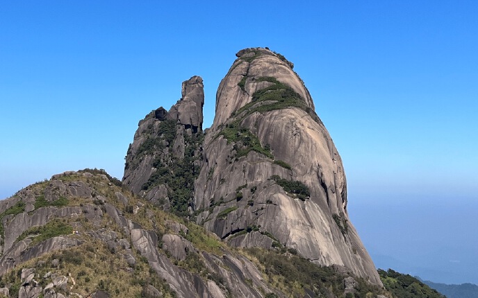 三分石,又称三峰石,是九嶷山的最高峰,海拔高达1822米。它由三块360余米高的花岗岩组成,峰下瀑布飞流直下,峰上白云缭绕,景色壮观。关于其名字的由来,有两种说法:一是因瀑布分成岿水、满水、沱水而得名;二是因舜帝驾崩后,此山每年长高三分而得名。香炉石,又名仙炉山,海拔1781米。绵延于宁远、蓝山两县之间,西接畚箕窝,北连三分石,南接八仙下棋、金鸡岭诸峰。山名有两种说法:一是因山顶形似香炉而得名;二是因当地是祭舜焚香之地而得名。从坪源村出发,经过庙冲、烂泥坳、敬天台,最后到达三分石和香炉石。