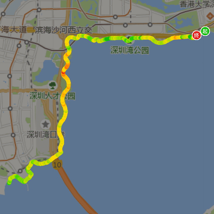 从深圳湾地铁站出发往返共二十公里左右的半马路程,配速 6~7 分/公里,欢迎差不多配速的伙伴
