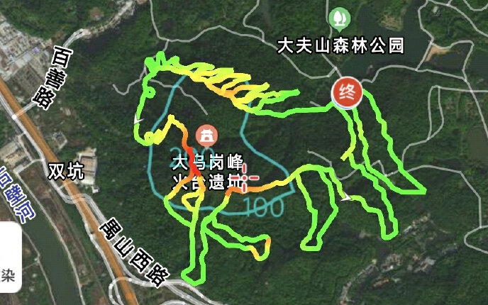 徒步路线:七盏灯山塘边(健身区旁)(起点)~欧地山、石马山绕圈画马尾巴~欧地山、大乌岗烽火台遗址、二乌岗、三乌岗绕圈画马背马鬃马头马眼睛马前腿~二乌岗、三乌岗、石马山绕圈画马肚马后腿~七盏灯山塘边(健身区旁)(终点)。