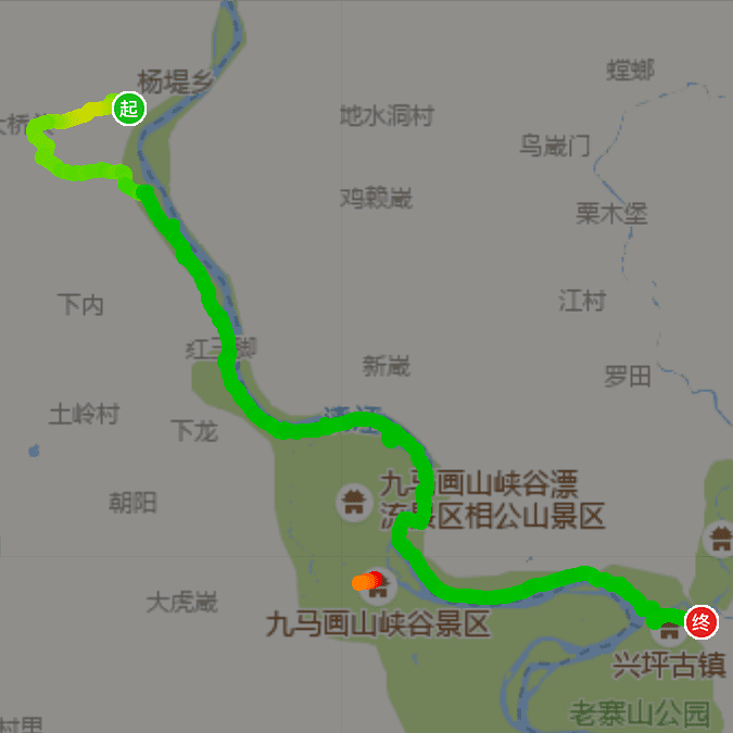 杨堤码头(摆渡10元)→水岩头村 → 童子拜观音 → 浪石古村 → 全家洲码头(摆渡10元)→ 甲天下石碑 → 九马画山 → 冷水渡口(摆渡5元)→ 20元背景观景台 → 兴坪古镇