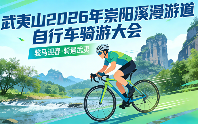 为深入推进全民健身与文旅融合发展,充分发挥崇阳溪漫游道资源优势,打造安全、友好、可参与度高的群众性骑行活动,组织开展2026年崇阳溪漫游道“骏马迎春·骑遇武夷”自行车骑游大会。活动以“慢骑行、深体验、强陪伴”为核心理念,倡导健康生活方式,让市民与游客在骑行中感受武夷山的自然山水之美与人文底蕴。本次活动指导单位:南平市体育局 主办单位:武夷山市文化体育和旅游局