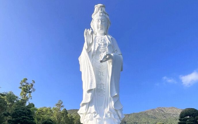 香港慈山寺在香港大埔区,背靠八仙岭、面朝船湾淡水湖;由李嘉诚发心筹建,2003年启动、2015年开放;唐风建筑融合现代设计,占地约4.68万平方米,推行以水代香的环保礼佛 。观音圣像身高76米(全球第二大纯白户外观音像)